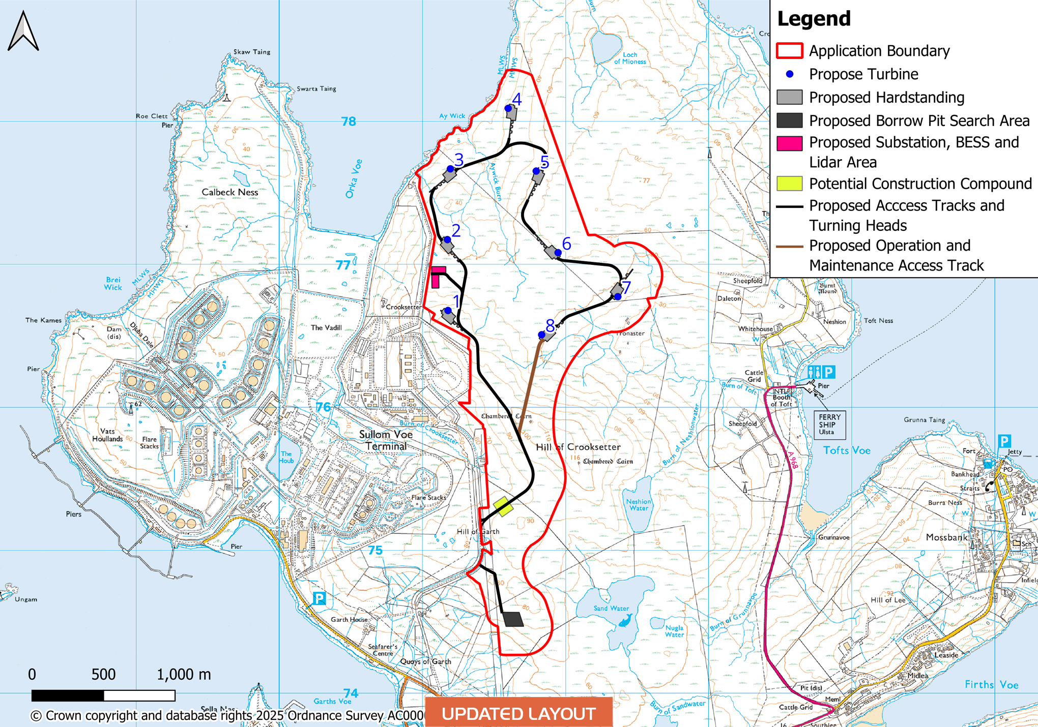 Since our previous event, the project design has been further refined following community feedback and the findings of detailed environmental assessments. The design phase is now complete, and the final layout will be submitted to the Scottish Government’s Energy Consents Unit as part of the planning process. The updated design includes the removal of two turbines, increasing the distance to the nearest residential properties in Toft. This change also helps to reduce potential effects on birds, peat, watercourses, and cultural heritage assets. The final layout seeks to balance community input, environmental considerations, and project objectives.